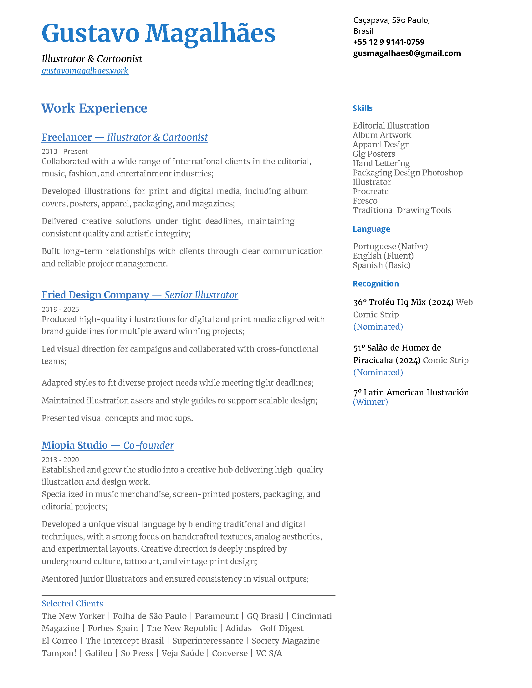 The New Yorker, Folha de São Paulo, The Intercept, Paramount, Jeep, GQ, Volkswage,Cincinnati Magazine, Forbes Spain, The New Republic, Golf Digest, Adidas, VC S/A, El Correo, Veja Saúde, Você RH, Sesc, Superinteressante, Society, Tampon!, The Academy, Galileu, So Press, Converse, Mol Impacto